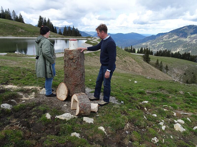 Anschließend ging es für die Teilnehmer weiter zum fast 400 m höher gelegeneren Speichersee. Zuvor wurde noch ein kurzer Zwischenstopp an der Pumpstation eingelegt. Leistungsstarke Pumpen im Keller der Talstation pumpen das Wasser zur Pumpstation. Von dort aus gelangt es dann weiter in den Speicherteich. Dieser fasst 150.000 Kubikmeter Wasser, von welchen in der Regel zwei Drittel aus Schmelzwasser und Niederschlag stammen. Zur Überwachung des Gebiets rund um den Speichersee und insbesondere im Dammbereich hat das Ingenieurbüro Harald Miklautz ein Messnetz eingerichtet, das jährlich nachgemessen wird. Für die Messpunkte in Wegnähe hat man sich dabei etwas ganz Besonderes einfallen lassen: Sie sind in einem hohlen Baumstamm versteckt. So integrieren sie sich einerseits besser in das Landschaftsbild, andererseits sind die Pfeiler vor Torsion durch Sonneneinstrahlung geschützt.
