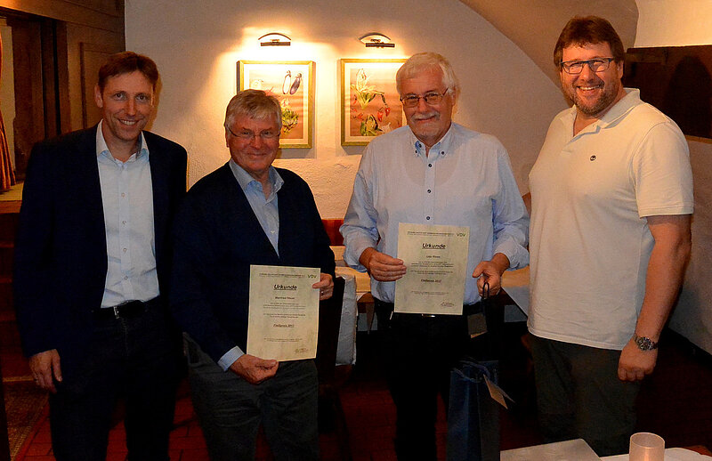Die neuen Bergbauexperten kehrten im Anschluss in die Wasserburg Haus Kemnade zum gemeinsamen Abendessen und Ausklang des Abends ein. Bei dem geselligen Abend wurden die diesjährigen Jubilare Carl-Wilhelm Schmälter (50 Jahre), Andreas Boldt und Jürgen Wagner (25 Jahre) geehrt. Leider konnte die Urkunde nur an Carl-Wilhelm Schmälter durch den Landesvorsitzenden Ulf Meyer-Dietrich übergeben werden. Seit 2005 wird im Bezirk der Fleißpreis ausgelobt für denjenigen der die meisten Veranstaltungen besucht hat. Erstmal musste der Preis geteilt werden, Udo Risse und Manfred Heuer lagen gleichauf und haben 85% der Veranstaltungen des Bezirks beigewohnt.