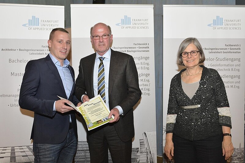 Im Rahmen einer feierlichen Abschlussveranstaltung verleiht der Landesvorsitzende Bernd Sack an Herrn Bachelor of Engineering Felix Herr für seine herausragende Abschlussarbeit mit der Note 1,1 den VDV-Preis Hessen.