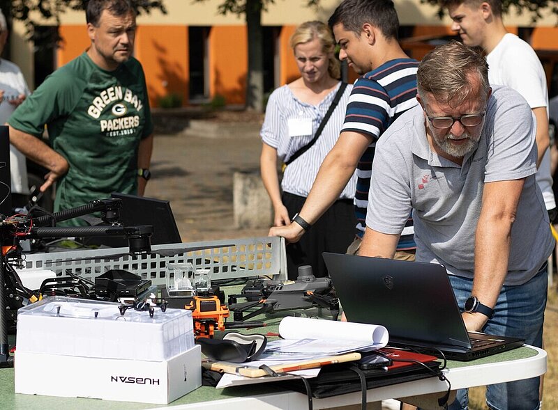 Das Highlight schlechthin war das Klassenfoto mittels Multikopter (Drohne), wobei jedem Schüler im Nachgang ein Abzug als Erinnerung übergeben wird. Aber auch das erste eigene kleine Nivellement, die erste eigene erzeugte GPS-Koordinate, die ersten Erfahrungen am Okular/Objektiv eines Tachymeters, die ersten erzeugten eigene Geodaten als Shape in einem GIS oder die Vorführung hochwissenschaftlich erzeugte Geodaten (hier: Thermalscanner) lassen für die potentiellen neuen Fachkräfte in der Geodäsie / Geoinformation den Schluss zu: Der Erlebnistag Geodäsie Sachsen-Anhalt hatte vieles zu bieten – da könnte ggf. ein später ergriffener Beruf in der Geodäsie / Geoinformation vielschichtig und definitiv nicht langweilig sein. Wir freuen uns auf Euch, um unsere langjährigen beruflichen Erfahrungen an Euch und so in die nächste Geodäten-Generation überführen zu können. Traut Euch, informiert und bewerbt Euch bei einem der vielen Ausbildungsbetriebe im Berufsfeld der Geodäsie / Geoinformation.